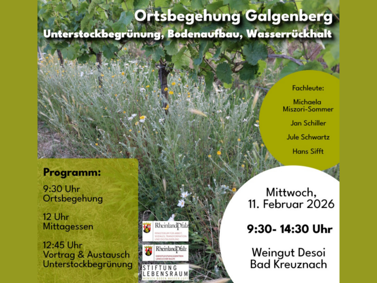 9:30 Uhr Ortsbegehung auf dem Galgenberg. Themen: Wasserrückhalt, Bodenqualität, Staunässe, Bodenverdichtung, Humusaufbau, Unterstockbegrünung, Wegepflege. Mit Bodenkundlerin Jule Schwartz, Weinbauberater*innen Michaela Miszori-Sommer und Jan Schiller sowie Hans Sifft von der Stadt Bad Kreuznach