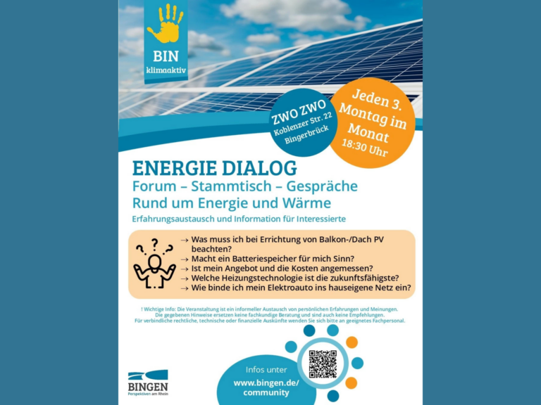 Der Energie-Dialog ist Teil der Klima Community der Stadt Bingen. Neben Fachvorträgen finden regelmäßig offene Treffen an jedem dritten Montag im Monat ab 18:30 Uhr im Zwo Zwo Bingen statt. Dabei werden Energie- und Wärmethemen gemeinsam diskutiert und weiterentwickelt. Der nächste Termin findet außerplanmäßig am 23. Februar 2026 statt. Weitere Informationen zum Energie-Dialog sind online unter www.bingen.de/energiedialog zu finden.
